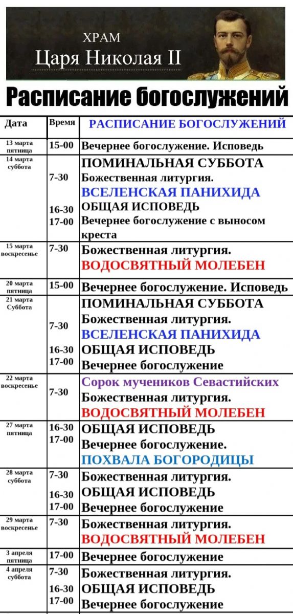 Расписание в храме святого страстотерпца Царя Николая II