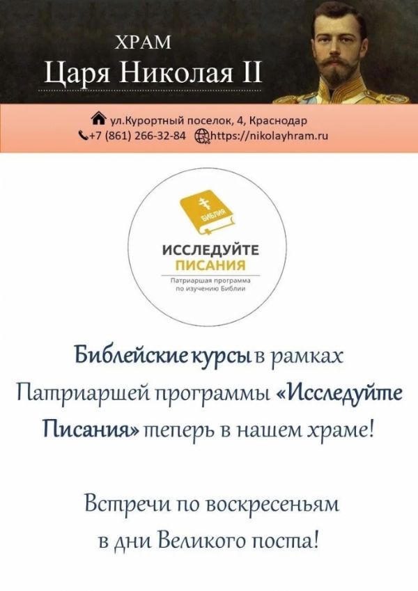 В храме св.страст Царя Николая по благословению настоятеля протоиерея Георгия будут проходить библейские курсы в рамках Патриаршей программы "Исследуйте Писания ".